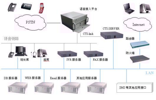 基本部分是呼叫中心的必要組成部分;静糠职ǎ褐悄芫W(wǎng)絡(luò)(IN)、自動(dòng)呼叫分配設(shè)備(ACD)、交互式語(yǔ)音應(yīng)答系統(tǒng)(IVR)、CTI服務(wù)器、人工座席、數(shù)據(jù)庫(kù)服務(wù)器、管理平臺(tái)等;擴(kuò)展部分是隨著呼叫中心技術(shù)的發(fā)展而逐漸豐富的,擴(kuò)展部分目前主要包括:Web服務(wù)器、Email服務(wù)器、傳真服務(wù)器、IP電話網(wǎng)關(guān)等。系統(tǒng)結(jié)構(gòu)如下圖所示: