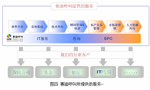 同時,賽迪呼叫所推薦給企業(yè)的并非只是軟件,而是結(jié)合了賽迪呼叫豐富的運(yùn)營服務(wù)經(jīng)驗(yàn)、技術(shù)服務(wù)能力的全方位信息化服務(wù)。賽迪呼叫的這種全面的信息化服務(wù),涵蓋IT服務(wù)、咨詢服務(wù)、BPO等,圖四給出了相應(yīng)展示。