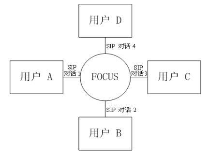 緊耦合會議的邏輯架構(gòu)圖如圖三所示。會議中的核心是“會議中心(conference focus)”,每一個會議都有一個會議中心,由一個URI標(biāo)識,用戶通過聯(lián)系這個URI參加到一個會議中去。會議中心和用戶之間的拓?fù)浣Y(jié)構(gòu)為星性結(jié)構(gòu)。會議中心為用戶提供并維持一個信令連接,并且可以執(zhí)行會議策略,實(shí)現(xiàn)對會議的控制和管理。