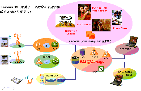 由于IMS與接入無(wú)關(guān)的技術(shù)特點(diǎn),IMS@vantage支持各種接入方式,如無(wú)線接入中的WLAN、GPRS、WCDMA/TD-SCDMA等,這些無(wú)線資源都能作為用戶接入技術(shù)與IMS系統(tǒng)連接。此外,西門子目前也實(shí)現(xiàn)了在固定接入方式下的多種應(yīng)用。