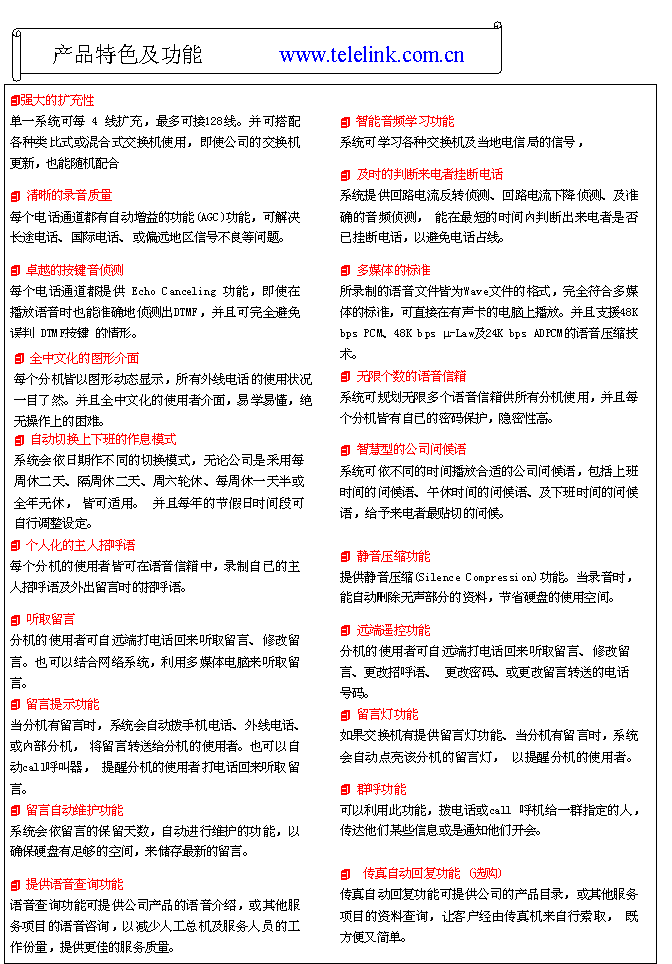 系統(tǒng)可提供直撥分機(jī),呼叫器,電話,移動電話或點(diǎn)留言燈的方式通知分機(jī)主人有留言,聽完留言即滅燈