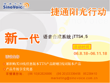 為慶祝jTTS4.5的上市,同時(shí)也為回饋廣大用戶,捷通華聲進(jìn)行為期三個(gè)月的推新品“陽(yáng)光行動(dòng)”!詳情敬請(qǐng)瀏覽:http://www.sinovoice.com.cn/xwzx/20060818.htm