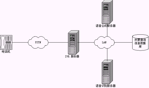 這種模式是最常見的一種接入情況。將原有煩瑣的按鍵式提示改成更具人性化的交談式語音交互,類似于語音門戶模式。這是目前大家普遍認同的一種語音識別技術應用方式。相比原有的按鍵方式,系統(tǒng)的新穎程度、個性化程度、用戶操作的方便程度等都得到了極大的提高,如語音識別技術在股票查詢中的成功應用,在點歌系統(tǒng)中的成功應用等;另外利用語音識別技術也解決了一些原有系統(tǒng)無法實現(xiàn)的技術難題,如火車時刻查詢、機場航班查詢等,原有系統(tǒng)借助郵政編碼、電話區(qū)號等的方式讓人無所適從,現(xiàn)在直接和系統(tǒng)交談,順利獲取所需信息,可以說是語音識別技術一個成功的應用。這種系統(tǒng)的拓撲結構如下圖示: