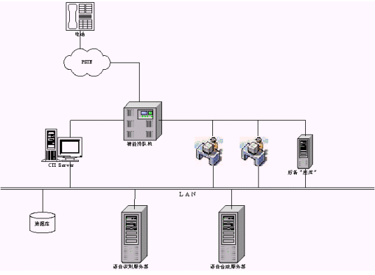 IVR模式是最常見的一種模式,這種模式也可以結合應用到前端以交換機接入的系統(tǒng)中去,在系統(tǒng)的IVR服務流程上,做出相應的修改,加入語音識別技術,同樣可以得到成功應用。另外一種模式暫且稱它為后備模式,該模式一個主要的特點是放在后端,比如在有座席接聽的情況下,采用語音識別技術的系統(tǒng)不被激活,也就是系統(tǒng)不給派線。當系統(tǒng)繁忙,而座席都占用的情況下,系統(tǒng)派線到采用語音識別技術的系統(tǒng),如同一個備用的座席。在這樣一個"座席"的軟件設計上,如同與人的交談一樣,系統(tǒng)也提出正常的詢問,但必須強調(diào)引導用戶來按照事先設定好的流程進行。這樣可以保證系統(tǒng)的接通率,特別是在一些對接通率和服務及時性要求比較高的場合采用,典型的代表如電信114查號臺和移動的1860客服中心,這些系統(tǒng)往往是隨著用戶急劇增加,撥打量也在穩(wěn)步上升,而呼叫響應要求及時。系統(tǒng)拓撲結構如下圖示。