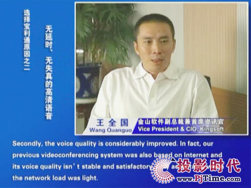 金山軟件副總裁兼首席資訊官王全國(guó)先生說(shuō)道:“對(duì)于軟件行業(yè)來(lái)說(shuō),及時(shí)、高效的溝通是保持競(jìng)爭(zhēng)優(yōu)勢(shì)的重要前提。相比之前使用的標(biāo)清產(chǎn)品,寶利通高清視頻會(huì)議系統(tǒng),提供了完全不同的體驗(yàn),流暢的高清晰畫面猶如真實(shí)的面對(duì)面溝通。而且我們公司并沒有申請(qǐng)專線,所有的應(yīng)用都是基于公網(wǎng)實(shí)現(xiàn)的。另一方面,新型全中文定制菜單的運(yùn)用,令我們使用起來(lái)非常方便,這更提高了我們使用視頻通信手段實(shí)現(xiàn)異地溝通的熱情!