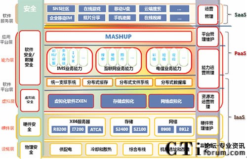 根據(jù)產(chǎn)品特性,中興通訊云計算架構(gòu)細(xì)分為硬件層、虛擬層、軟件平臺層、能力層、 應(yīng)用平臺以及軟件服務(wù)層,對應(yīng)經(jīng)典云計算架構(gòu)中IaaS、PaaS、SaaS三層服務(wù)。