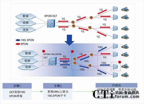 項目選取的試點小區(qū)建設于2006年,原來規(guī)劃的是每用戶6M帶寬。后期小區(qū)實裝率高,實際用戶超過1500戶,IPTV業(yè)務申請量提升后,出現了高峰時段IPTV點播業(yè)務不流暢、同時應用IPTV和上網業(yè)務時網速過慢等問題。而且當湖北電信新推出10M~20M的新寬帶套餐時,該小區(qū)用戶申請新套餐數量受限。該小區(qū)的寬帶接入網絡已經明顯無法滿足用戶日益增長的需求,寬帶提速正當其時。選擇10G EPON,能夠簡單兩步,將小區(qū)接入方式從EPON平滑升級為10G EPON,無需改變網絡結構,只需簡單升級設備(見圖)。
