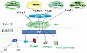 VPN中,實(shí)現(xiàn)業(yè)務(wù)在VLAN 和VPN中的無(wú)縫對(duì)接,以保證用戶(hù)數(shù)據(jù)的安全、高效傳輸;接入網(wǎng)采用基于RPR或SDH的MSPP環(huán)實(shí)現(xiàn)IP業(yè)務(wù)和TDM業(yè)務(wù)的綜合傳輸;在商業(yè)樓宇內(nèi)主要采用IAD設(shè)備將客戶(hù)的數(shù)據(jù)、語(yǔ)音、專(zhuān)線等業(yè)務(wù)接入CNC