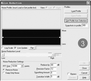 from Selection按鈕,程序會(huì)讀入噪音樣本,之后關(guān)閉該對(duì)話框回到主界面,單擊噪音樣本音軌,按Delete刪除它,再雙擊另外一個(gè)波音音軌,進(jìn)入波音編輯器界面再雙擊,全選之后按照上面的操作再次打開Noise