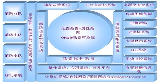 支撐平臺(tái)有計(jì)算機(jī)網(wǎng)絡(luò)系統(tǒng)、監(jiān)控系統(tǒng)、顯示系統(tǒng)、GPS系統(tǒng)、有/無線通信系統(tǒng)、圖像傳輸系統(tǒng)、電源及機(jī)房、軟件支撐平臺(tái)等。其中,計(jì)算機(jī)網(wǎng)絡(luò)系統(tǒng)包括指揮中心、二級(jí)指揮中心與移動(dòng)指揮中心、業(yè)務(wù)執(zhí)行機(jī)構(gòu)(如:應(yīng)急中隊(duì)、派出所等)之間的三級(jí)計(jì)算機(jī)網(wǎng)絡(luò),即指揮中心局域網(wǎng)絡(luò)、業(yè)務(wù)機(jī)關(guān)網(wǎng)絡(luò)、與分支機(jī)關(guān)的廣域網(wǎng)絡(luò)、與移動(dòng)指揮中心的遠(yuǎn)程訪問網(wǎng)絡(luò)。指揮中心與二級(jí)指揮中心、分支機(jī)構(gòu)、移動(dòng)中心之間有語音通信、數(shù)據(jù)通信,指揮中心與移動(dòng)中心有語音通信、數(shù)據(jù)通信(無線)、現(xiàn)場(chǎng)圖像傳輸;指揮中心與公安其它機(jī)構(gòu)通過撥號(hào)網(wǎng)絡(luò)訪問(內(nèi)網(wǎng)),指揮中心與普通老百姓通過撥號(hào)網(wǎng)絡(luò)訪問(外網(wǎng))。
