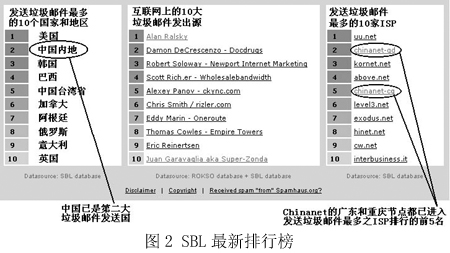 圖2是國際上著名的反垃圾郵件組織Spamhaus在網(wǎng)站上列出的統(tǒng)計(jì)排行榜,“China”已經(jīng)穩(wěn)居第二大垃圾郵件發(fā)送國的位置,而右邊的一個(gè)排行榜則從另一個(gè)角度向我國敲響了警鐘——在專為發(fā)送垃圾郵件的ISP所列的黑名單SBL中,我國Chinanet的兩個(gè)省級ISP在前10名中分列第2和第5名。而Chinanet作為中國的公用信息互聯(lián)網(wǎng)絡(luò),是我國的Internet骨干網(wǎng),是國內(nèi)用戶接入互聯(lián)網(wǎng)的主要途徑之一!拔覀冋娌幌M赃@樣的方式‘揚(yáng)名海外’”,來自一家ISP的一位不肯透露姓名的女士說,“其實(shí)我們也是受害者!”