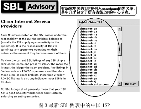 垃圾郵件損害的不只是中國的國際形象,中國反垃圾郵件聯(lián)盟的葉豪告訴記者,類似SBL(更一般的是RBL,即“實(shí)時(shí)黑名單”)這樣的服務(wù)是由國外的一些公司或第三方組織提供的,目前已經(jīng)成為國際上比較通行的防范垃圾郵件的措施。而在具備較高知名度的Spamhaus所維護(hù)的這份黑名單中,我國的ISP竟然多達(dá)80家(如圖3),幾乎所有的省級ISP都位列其中。“中國很多大的ISP都在不同的‘黑名單’里,從這些國內(nèi)ISP發(fā)出的郵件,那些用‘黑名單’的客戶根本就收不到。現(xiàn)在‘黑名單’是比較好用的一種辦法,所以使用‘黑名單’服務(wù)的企業(yè)也越來越多,國際上針對中國的信息壁壘就越來越厲害,再不采取措施,中國就等著被全世界‘封掉’吧!”