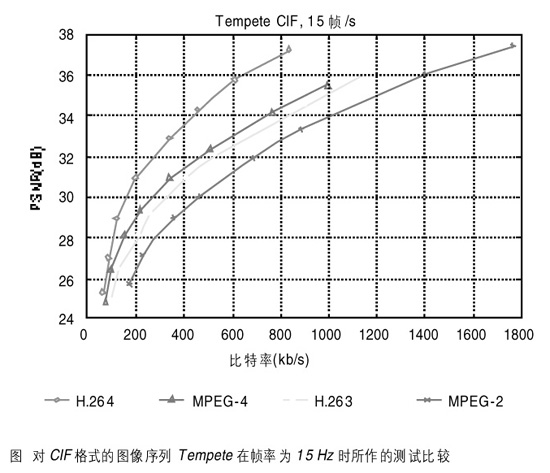 為了闡述H.264的編碼效率,我們將其與其它標準如MPEG-2、H.263、MPEG-4等作比較。使用QCIF、CIF格式的圖像序列作測試,所有編碼器都使用拉格朗日優(yōu)化技術。我們使用H.264的測試軟件JM2.0并使用了Main Profile的主要技術特征。對H.263和H.264采用的參考幀數為5,只編碼圖像序列的第一幀為I幀,每2個參考幀P之間插入2個非參考幀B。使用全搜索方式進行32×32整數范圍的運動估計,且由預先設定的量化參數來進行比特率的調整。圖為對CIF格式的圖像序列Tempete在幀率為15Hz時所作的測試比較。