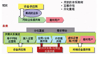軟交換已經(jīng)從一種單純的技術(shù)發(fā)展成為網(wǎng)絡(luò)演進(jìn)中的一種理念,這種理念的一個核心就是更加開放。而傳統(tǒng)運(yùn)營商由垂直化的網(wǎng)絡(luò)、業(yè)務(wù)一體化對用戶“絕對控制”狀態(tài)走向開放化、平臺化管理的多業(yè)務(wù)單元共同參與的價值鏈最終方向,的確需要長期的過程。并且,這種發(fā)展過程的決定因素將不取決于技術(shù)發(fā)展的成熟與否,而是鏈條中各成員的生存狀態(tài)與利益分配。正如文中提到的,隨著網(wǎng)絡(luò)和應(yīng)用的不斷發(fā)展,業(yè)務(wù)與網(wǎng)絡(luò)的關(guān)系、運(yùn)營商和業(yè)務(wù)經(jīng)營者的角色都將發(fā)生改變。