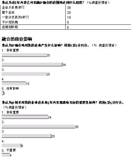 我們調查的企業(yè)中,有超過三分之二將在未來五年內實現(xiàn)大多數(shù)或者所有部門向融合網絡的轉型。大部分企業(yè)采取按部就班的形式在某些特殊部門和業(yè)務開始部署。在融合應用中,IP語音電話將在未來三年內吸引大量投資;管理人士期望通過大幅削減公司內部的通話費用獲得早期的回報。在更廣泛的層面上,大多數(shù)管理者預計,融合網絡對其企業(yè)的商業(yè)影響將會“非常重要”或者“重要”。