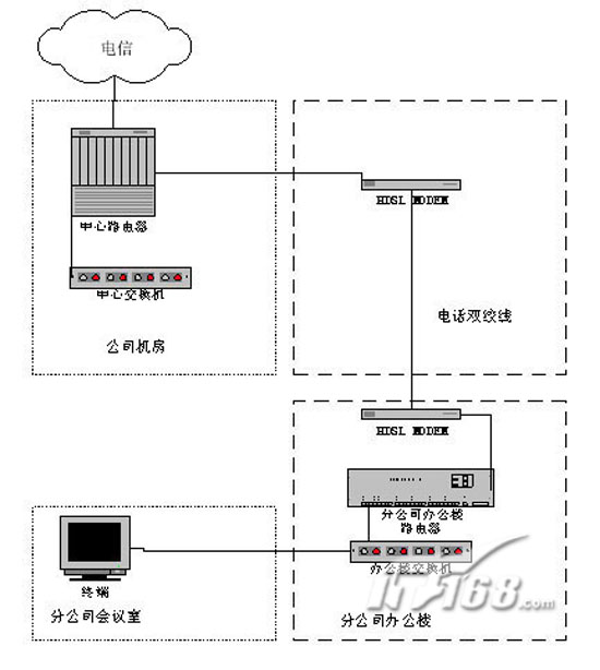 MODEM,就可以實現(xiàn)用戶到電信骨干網(wǎng)的網(wǎng)絡(luò)接入。網(wǎng)絡(luò)中心機(jī)房的HDSL MODEM通過V.35線纜直接接入到網(wǎng)絡(luò)中心的路由器上,用戶的HDSL