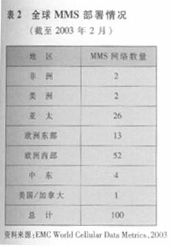 據(jù)EMC統(tǒng)計(jì),到2003年2月,全球在47國家有100家運(yùn)營商部署了MMS網(wǎng)絡(luò)(見表2)。