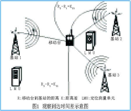 觀察到達(dá)時(shí)間差(OTDOA)是通過(guò)測(cè)量電波從發(fā)射機(jī)傳播到多個(gè)接收機(jī)的傳播時(shí)間差來(lái)確定目標(biāo)移動(dòng)臺(tái)的位置。初步測(cè)量通過(guò)UE接收的下行鏈路公共導(dǎo)頻信道的到達(dá)時(shí)間差實(shí)現(xiàn)。3個(gè)基站形成的平面上,一點(diǎn)到兩個(gè)固定點(diǎn)的距離差如為定值時(shí),該點(diǎn)必定在一條雙曲線(xiàn)上,兩條這樣的雙曲線(xiàn)的交點(diǎn)便可得到移動(dòng)臺(tái)的位置,如圖1