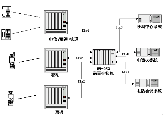 - 能與多個(gè)運(yùn)營(yíng)商的交換機(jī)連接,將呼叫分配到后端的多種語音業(yè)務(wù)系統(tǒng)。