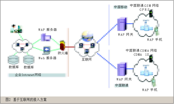 如圖2所示,本方案適用于已經(jīng)有基于互聯(lián)網(wǎng)架構(gòu)Web應(yīng)用部署的中小型企業(yè),企業(yè)只需在安裝Web服務(wù)器的位置再設(shè)置一臺(tái)WAP服務(wù)器即可(為了節(jié)約成本,WAP服務(wù)器甚至可以直接部署在Web服務(wù)器上),并不需要改變現(xiàn)有網(wǎng)絡(luò)的拓?fù)浣Y(jié)構(gòu),也不用關(guān)心用戶的連接方式,企業(yè)并不參與中國(guó)移動(dòng)(中國(guó)聯(lián)通)內(nèi)部數(shù)據(jù)網(wǎng)絡(luò)與互聯(lián)網(wǎng)的網(wǎng)絡(luò)聯(lián)接,具有投資省、部署快、易維護(hù)的特點(diǎn)。網(wǎng)絡(luò)安全性依賴于與互聯(lián)網(wǎng)相連的防火墻的可靠性,安全性能中等。