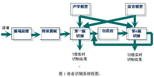 圖1所示為當前大多數(shù)語音識別系統(tǒng)采用的框架和流程。原始語音經(jīng)前端處理后,從中提取出若干維的特征向量用于識別。識別時,聲學模型和語言模型共同作用,得到使某一概率最大的字串作為識別結(jié)果。