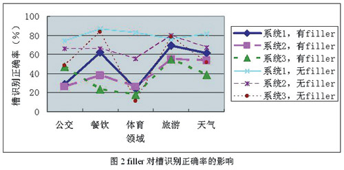 對于電話連續(xù)語音識別來說,由于錄制環(huán)境是辦公室真實環(huán)境,因此噪音并不是影響性能的主要因素。電話連續(xù)語音識別分為5個子領(lǐng)域,每個子領(lǐng)域各有一套語法。評測句子由語法生成的有效成分在前后加上任意長的填充詞(filler)構(gòu)成,如語法生成的句子為“從天安門到中關(guān)村怎么坐公交車”,而實際錄制的句子是“你好,請問從天安門到中關(guān)村怎么坐公交車,可以查到嗎?”,其中的“你好,請問”和“可以查到嗎”就是filler。由分析可以發(fā)現(xiàn),不同領(lǐng)域內(nèi)的槽識別正確率相差很大。這主要有兩個原因,一是不同領(lǐng)域的語法復(fù)雜度不同,二是不同領(lǐng)域內(nèi)有filler的句子所占比例不同。為了進一步衡量filler對識別的影響,選取三個識別系統(tǒng),將有filler的句子和沒有filler的句子分別計算識別率,統(tǒng)計結(jié)果如圖2所示。從圖中可以看出,filler對識別的影響是相當大的,無filler的句子比有filler的句子識別正確率可以高幾十個百分點。