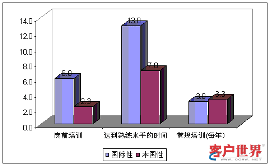 總體看來,印度呼叫中心提供平均為4.1周的崗前培訓(xùn)。其中,國際性呼叫中心平均提供6周崗前培訓(xùn),明顯高于本地性呼叫中心的2.3周。這是因為國際呼叫中心把崗前培訓(xùn)的相當(dāng)一部分時間投入到英語能力的培訓(xùn)和提高上面。此外,參加調(diào)研的呼叫中心主管認為,新員工平均在開始工作10周以后才能達到熟練水平。同樣地,我們發(fā)現(xiàn)國際性呼叫中心和本地性呼叫中心在這一指標上存在顯著差異。在國際性呼叫中心需要達到熟練水平的時間