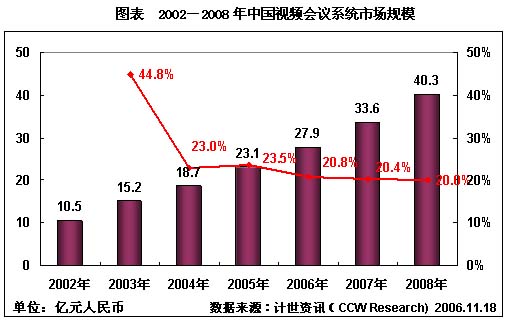 在2003年的井噴式發(fā)展之后,視頻會議系統(tǒng)市場發(fā)展速度開始進入低速發(fā)展階段,市場逐漸出現(xiàn)飽和的趨勢。計世資訊(CCW Research)最新視頻會議報告數(shù)據(jù)顯示,從2003年非典時期視頻會議市場井噴式發(fā)展之后,2006年視頻會議系統(tǒng)的增長率開始下降,如何開發(fā)新的產(chǎn)品,成為視頻會議系統(tǒng)市場繼續(xù)發(fā)展的關鍵。而3G商用的到來,由此產(chǎn)生的移動視頻業(yè)務也必將成為未來移動通信新的市場增長點,可以說,移動信息化建設將為視頻會議系統(tǒng)開拓一片新的藍海。