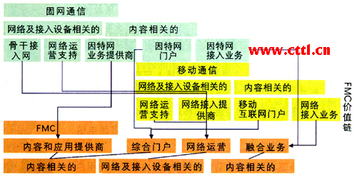 總之,在FMC新配置的價值鏈中,應用和內容的作用非常重要,因為他們在融合時將價值鏈中的各個部分連接起來。因此,可以認為內容和應用的建立、積累將會推動增值FMC業(yè)務的發(fā)展。今后隨著在內容和業(yè)務領域將出現更多不同的參與者,如內容提供商、應用提供商和中間件提供商,FMC價值鏈將進一步得到更深層次的合作、擴張和合并。這些在新的價值鏈中出現的更多獨立但又不同的實體,將直接反映FMC融合的特征。