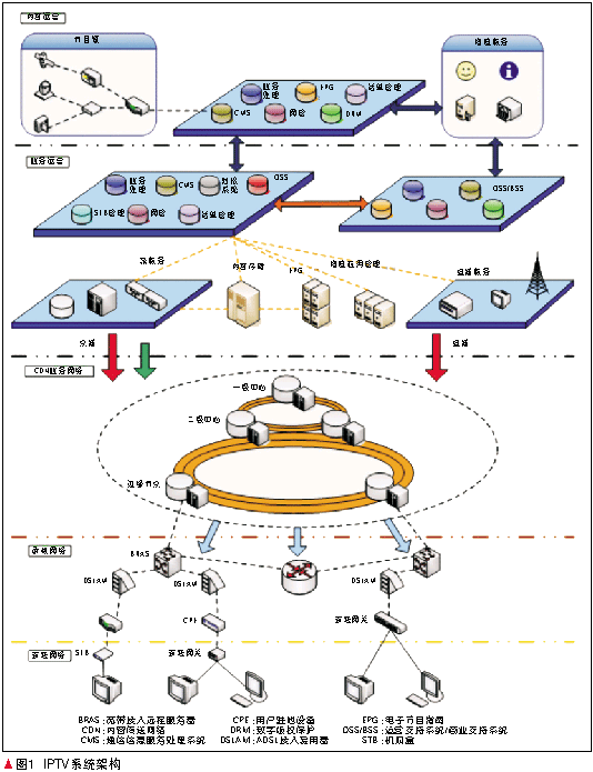 圖1所示為IPTV系統(tǒng)架構(gòu)。IPTV通用系統(tǒng)的邏輯結(jié)構(gòu)由內(nèi)容運(yùn)營(yíng)平臺(tái)、業(yè)務(wù)運(yùn)營(yíng)平臺(tái)、內(nèi)容傳送(CDN)業(yè)務(wù)網(wǎng)絡(luò)、承載網(wǎng)絡(luò)、家庭網(wǎng)絡(luò)5部分所構(gòu)成。