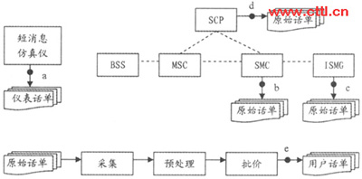 通過(guò)對(duì)移動(dòng)點(diǎn)對(duì)點(diǎn)短消息計(jì)費(fèi)原理的分析,可以把整個(gè)計(jì)費(fèi)過(guò)程劃分為兩大環(huán)節(jié):計(jì)費(fèi)點(diǎn)原始話單的生成和后期計(jì)費(fèi)處理系統(tǒng)的處理。如果其中任何一個(gè)環(huán)節(jié)出現(xiàn)差錯(cuò)都會(huì)降低用戶計(jì)費(fèi)話單的準(zhǔn)確性。因此在測(cè)試過(guò)程中采取了用戶層面和設(shè)備層面相結(jié)合的方法:一方面使用仿真儀表大量模擬點(diǎn)對(duì)點(diǎn)短消息的發(fā)送和接收,得到用戶話單;一方面分析各個(gè)計(jì)費(fèi)點(diǎn)生成的原始話單。
