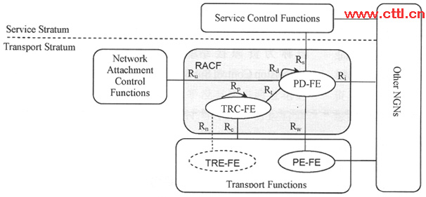 RACF由策略決策功能實(shí)體PD-FE和傳送資源控制功能TRC-FE兩個(gè)功能實(shí)體組成。PD-FE基于網(wǎng)絡(luò)策略規(guī)則、業(yè)務(wù)控制功能SCF提供的業(yè)務(wù)信息、網(wǎng)絡(luò)附著控制功能NACF提供的傳送層簽約信息,以及TRC-FE提供的資源接納決策結(jié)果,做出網(wǎng)絡(luò)資源接納控制的最后決策。可以基于每個(gè)流對(duì)傳送層的策略執(zhí)行功能實(shí)體。PE-FE下發(fā)資源接納控制策略。TRC-FE負(fù)責(zé)收集和維護(hù)傳送網(wǎng)的拓?fù)浜唾Y源狀態(tài)信息,基于拓?fù)、連接性、網(wǎng)絡(luò)、節(jié)點(diǎn)資源的可用性以及接入網(wǎng)中的傳送層簽約信息等網(wǎng)絡(luò)信息控制資源的使用,提供傳送網(wǎng)絡(luò)接納控制的決策。PD-FE通過(guò)Rt參考點(diǎn)請(qǐng)求TRC-FE檢測(cè)或者決定所請(qǐng)求的媒體流路徑上的QoS資源。