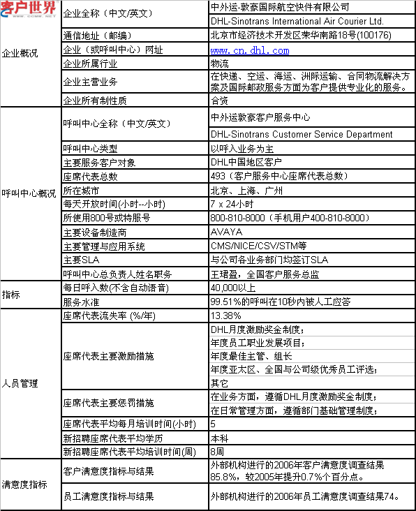中外運(yùn)敦豪客戶服務(wù)中心現(xiàn)主要負(fù)責(zé)DHL中國客戶呼入業(yè)務(wù),公司在北京(北方區(qū))、上海(東方區(qū))、廣州(南方區(qū))分別設(shè)立區(qū)域級呼叫中心,采用全國免費(fèi)客戶服務(wù)熱線800-810-8000接入,并使用400-810-8000為手機(jī)用戶提供服務(wù)。除了電話,還開通多種客戶溝通和聯(lián)絡(luò)渠道。在運(yùn)營方面執(zhí)行嚴(yán)格的行業(yè)質(zhì)量標(biāo)準(zhǔn)體系,在預(yù)定取件、服務(wù)咨詢、跟蹤查詢、服務(wù)補(bǔ)救、重要客戶支持、電子商務(wù)受理過程中精益求精,為客戶提供全天候、一站式、個性化的信息、數(shù)據(jù)和客戶服務(wù),與客戶建立長期的伙伴關(guān)系。