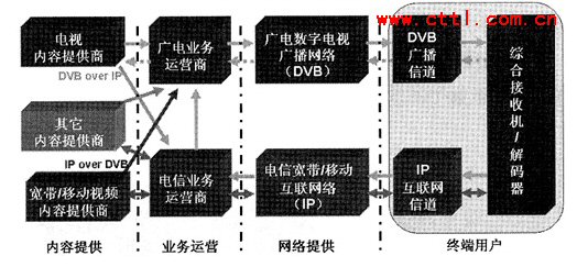 從圖2中我們可以看出,IPTV實(shí)際上有電信和廣電兩條業(yè)務(wù)通道。其中,電信的業(yè)務(wù)通道是雙向的通道,而廣電的業(yè)務(wù)通道是單向的,電視內(nèi)容提供商可以利用DVBoverIP技術(shù)通過電信業(yè)務(wù)運(yùn)營(yíng)商來開展IPTV業(yè)務(wù)。寬帶/移動(dòng)視頻內(nèi)容提供商也可以利用IPover