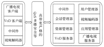 前端播放系統(tǒng)由許多部分組成,包括中間件,MPEG編碼器,VoD服務器,廣播電視服務器,用戶管理器,資源管理器,會話管理器和應用管理器。
