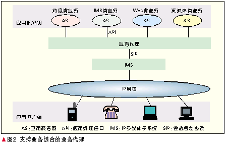 經(jīng)過多年的探索,業(yè)界取得共識網(wǎng)絡(luò)演進必須基于業(yè)務(wù)驅(qū)動的策略。必須指出的是,雖然基于SIP技術(shù)的IMS支持的業(yè)務(wù)從語音業(yè)務(wù)擴展到了寬帶多媒體業(yè)務(wù),然而其控制機理本質(zhì)上還是源于傳統(tǒng)電信網(wǎng),因此它最適合于提供的還是諸如VoIP、集群話音、集群視頻等實時會話型業(yè)務(wù),諸如Web、電子商務(wù)等純數(shù)據(jù)型業(yè)務(wù)并不適合由IMS提供,其他許多有前景的業(yè)務(wù),如流媒體業(yè)務(wù)、IPTV、消息類業(yè)務(wù)等的確IMS已提出或正在積極研究其提供方法,但是已有其他的非IMS提供方式。因此,切不要認為IMS是包羅萬象的,更確切地說,IMS是電信界提出的網(wǎng)絡(luò)融合技術(shù),考慮得更多的必然就是和傳統(tǒng)電信業(yè)務(wù)模式類似的業(yè)務(wù)。為了使IMS在未來融合的信息通信網(wǎng)絡(luò)中繼續(xù)保持其重要的地位,在積極研究擴大IMS業(yè)務(wù)能力的同時,必須研究新的體系結(jié)構(gòu)既能夠包容IMS型業(yè)務(wù),也能夠包容非IMS型業(yè)務(wù),由此形成融合的開放式的業(yè)務(wù)平面。這就是熱點研究之中的業(yè)務(wù)代理技術(shù),實際上就是架構(gòu)在IMS之上的綜合業(yè)務(wù)平臺,如圖2所示。它至少能夠提供4大類業(yè)務(wù):IMS類業(yè)務(wù)、消息類業(yè)務(wù)、流媒體業(yè)務(wù)、Web業(yè)務(wù)以及它們的組合,也就是說,除了IMS系統(tǒng)的SIP協(xié)議和API以外,業(yè)務(wù)平臺還應(yīng)能支持其他眾多的非IMS系統(tǒng)協(xié)議和接口,由此構(gòu)成融合的業(yè)務(wù)層。IMS系統(tǒng)是其中的一個重要組成部分,擔負起通信網(wǎng)絡(luò)的融合重任。