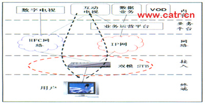 這種模式的合作點主要在接入層面,以提供雙模機頂盒為主要方法。固網(wǎng)公司和廣電發(fā)揮各自資源優(yōu)勢進行合作。廣電節(jié)目傳送由廣電負責,同網(wǎng)提供寬帶增值服務,兩者分業(yè)經(jīng)營,地位平等。