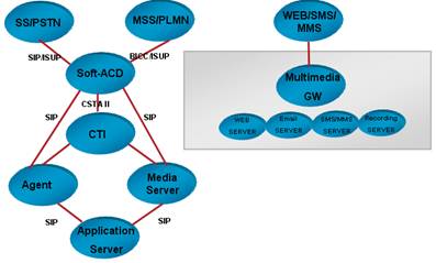 目前市場最常見的第三代呼叫中心是傳統(tǒng)的基于TDM的呼叫中心,應用了計算機電話集成(CTI)技術。隨著網(wǎng)絡的普及和NGN的發(fā)展,出現(xiàn)第五代呼叫中心NGCC。NGCC是以NGN為基礎構建的呼叫中心系統(tǒng),核心控制設備處理呼叫的能力較傳統(tǒng)呼叫中心大幅提高。NGCC的網(wǎng)絡架構和接口如圖3所示。