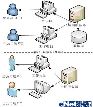 傳統(tǒng)軟件是在公司內(nèi)部架設(shè)軟件運(yùn)行環(huán)境,自己購(gòu)買應(yīng)用服務(wù)器、數(shù)據(jù)庫(kù)服務(wù)器、網(wǎng)卡等硬件,安裝自己的局域網(wǎng)并在局域網(wǎng)內(nèi)部署軟件。所以不同公司都各自部署一套自己的系統(tǒng)。不同公司的用戶事實(shí)是通過(guò)不同的途徑訪問(wèn)不同的系統(tǒng),如圖2所示: