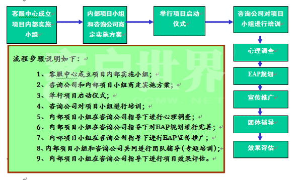 2007年11月,中國移動江蘇公司客戶服務中心EAP計劃正式啟動,這是中心為全體員工獻上的一份特別的“精神福利”。 EAP(Employee Assistance Program),中文被譯為“員工幫助計劃”,是由組織為其成員設(shè)置的一項長期的、系統(tǒng)的援助和福利計劃。它源于20世紀40年代的美國,目前美國中型和大型企業(yè)的EAP普及率為60―70%,英國有將近113個組織提供EAP服務、2200萬員工享受EAP服務,而在我國近年來也有許多企業(yè)開始運用EAP服務,中國陸續(xù)召開了三屆EAP年會,越來越多的企業(yè)開始關(guān)注員工的心理健康。