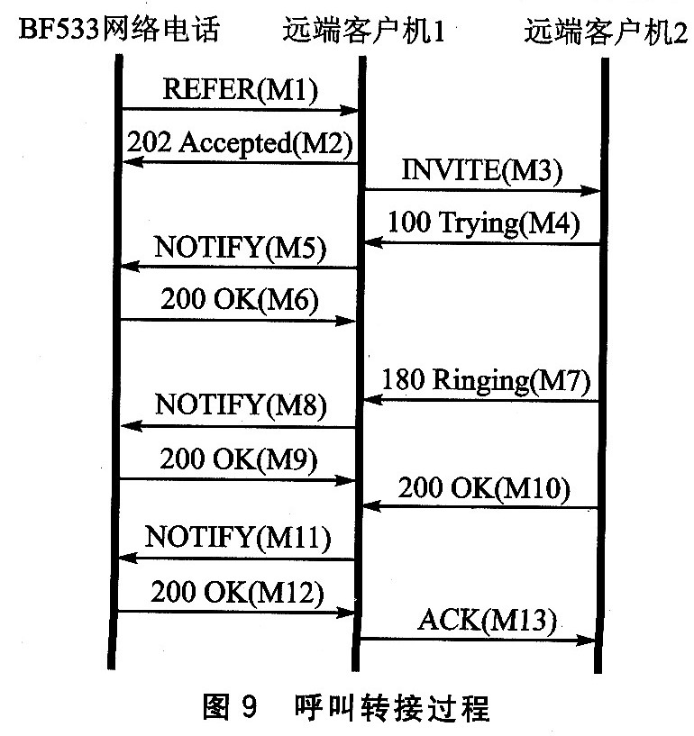 該過程是通過擴(kuò)展的SIP信令REFER來完成的,交互過程如圖9所示。當(dāng)BF533網(wǎng)絡(luò)電話要將它和遠(yuǎn)端客戶機(jī)1(RCl)的通話轉(zhuǎn)接到遠(yuǎn)端客戶機(jī)2(RC2)時,BF發(fā)送REFER(M1)給RCl,該信息中Refer—To字頭標(biāo)明了RC2的URL,之后RCl回復(fù)202