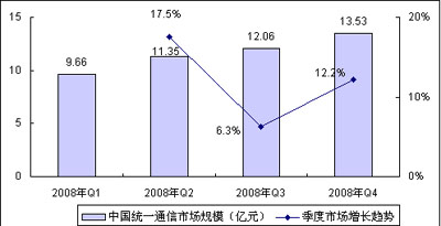 賽迪顧問預(yù)測,2008年全年中國統(tǒng)一通信市場都將保持快速的增長勢頭,雖然第三季度增長趨勢有所放緩,全球金融海嘯的反作用將進一步提高企業(yè)對統(tǒng)一通信產(chǎn)品的認(rèn)知,促進中國統(tǒng)一通信市場的發(fā)展,第四季度市場將出現(xiàn)反彈趨勢,增長速度超過12%,市場規(guī)模13.53億元,2008年全年中國統(tǒng)一通信市場規(guī)模將達(dá)到46.6億元,同比增長超過50%。