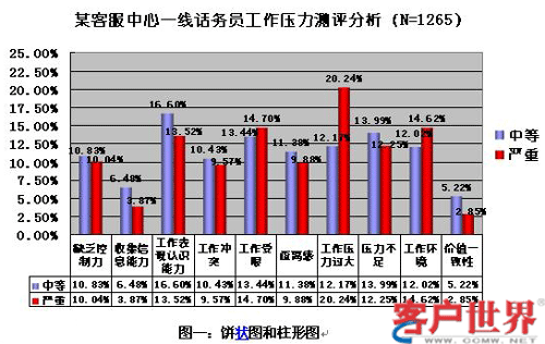標(biāo)準(zhǔn)的心理測(cè)驗(yàn)都有固定的評(píng)分體系,其結(jié)果解釋通常也是固定模式的,譬如在16PF人格測(cè)試中有一個(gè)因素是“聰慧性”,其低分解釋是:學(xué)識(shí)淺薄,抽象思考能力弱,通常學(xué)習(xí)能力不強(qiáng),不能“舉一反三”;高分解釋是:聰明、富有才識(shí),善于抽象思考,通常學(xué)習(xí)能力強(qiáng),思考敏捷。而針對(duì)呼叫中心人員的結(jié)果解釋就不能如此泛泛而談,應(yīng)結(jié)合座席代表的工作特性來(lái)做相應(yīng)的解釋?zhuān)菇Y(jié)果呈現(xiàn)得更直觀。另一種呈現(xiàn)測(cè)量結(jié)果的方式是采用下面餅狀圖或柱形圖的方式,采用此種方法的好處是用圖形便于更好地做差異性比較。