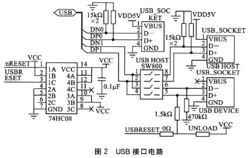 在ARM9開發(fā)板內(nèi)部含有1個(gè)USB2.O接口控制器,接口電路如圖2所示。共有3個(gè)LISB接口(2個(gè)Host和1個(gè)Device),通過(guò)選擇開關(guān)SW800進(jìn)行選通控制。74HC08作為4個(gè)二輸入與門邏輯電路,負(fù)責(zé)控制信號(hào)的邏輯組合。該接口用來(lái)連接USB接口的外部設(shè)備。