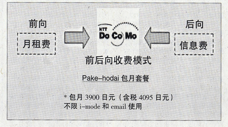 當(dāng)然,移動互聯(lián)網(wǎng)運營不僅可以前向向用戶收費,還可以采取后向的廣告收費模式,如圖NTT DoCoMo的數(shù)據(jù)業(yè)務(wù)資費模式: