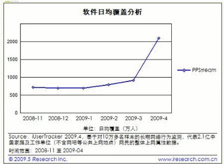 近日,艾瑞四月P2P流媒體數(shù)據(jù)出爐,PPS繼三月登頂后再次衛(wèi)冕成功。然而與三月相比較,PPS在短短一個(gè)月內(nèi)日均覆蓋人數(shù)從910.8萬人暴漲至2093.3萬人,令人乍舌的“驚變”引起了業(yè)內(nèi)人士甚至廣告主的密切關(guān)注。
