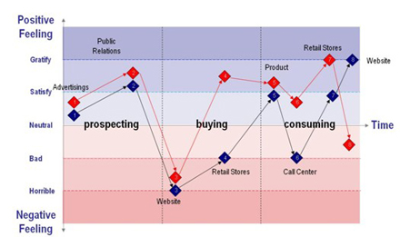 看一看“情感曲線”也許你就會頓悟。此處所示的兩條曲線來自兩個國際銀行。請注意曲線的不同之處。紅線所示的銀行與藍(lán)線所示的銀行相比在呼叫中心服務(wù)和店內(nèi)體驗(yàn)上都要略勝一籌。而藍(lán)線所示銀行在網(wǎng)上銀行這一項(xiàng)上表現(xiàn)更好!凹t線”銀行的競爭資本是其卓越的客戶互動體驗(yàn),無論是分行的面對面互動還是來自聯(lián)絡(luò)中心的遠(yuǎn)程體驗(yàn)都屬一流。