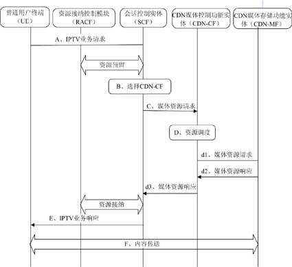- 會(huì)話控制實(shí)體收到IPTV業(yè)務(wù)請(qǐng)求后,根據(jù)用戶所在的地理位置、用戶類(lèi)型等信息選擇為該用戶服務(wù)的CDN-CF,并向CDN-CF發(fā)送媒體資源請(qǐng)求。