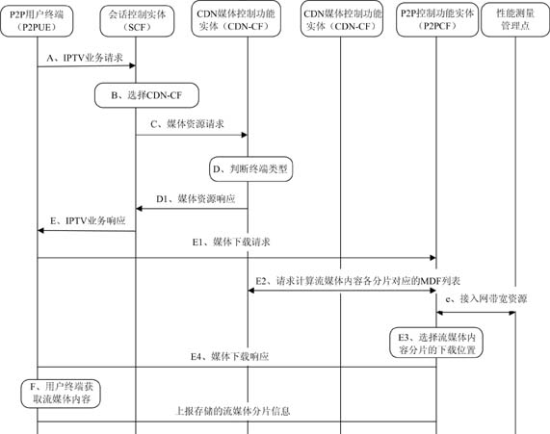 本架構(gòu)的最大特點(diǎn)是結(jié)合CDN和NGN架構(gòu)(注:為了簡(jiǎn)化沒(méi)有給出詳細(xì)的NGN相關(guān)控制實(shí)體,架構(gòu)中只體現(xiàn)了會(huì)話控制實(shí)體和資源接納控制功能實(shí)體),在此基礎(chǔ)上引入P2P相關(guān)功能,包括P2P控制實(shí)體和P2P用戶終端。通過(guò)對(duì)基于NGN的IPTV架構(gòu)和CDN架構(gòu)的改進(jìn),使該架構(gòu)既能夠具備電信網(wǎng)中網(wǎng)絡(luò)資源可控、可管的特征,又通過(guò)引入P2P具備了一定的靈活性和自組織能力,將電信網(wǎng)和互聯(lián)網(wǎng)技術(shù)的優(yōu)勢(shì)均集中在了一起。