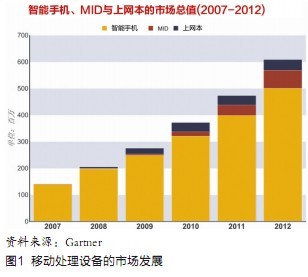 隨著3G對(duì)移動(dòng)信息處理的促進(jìn),未來幾年,MS市場尤其是智能化接入設(shè)備市場的增長將非常迅速,根據(jù)有關(guān)機(jī)構(gòu)的分析,智能手機(jī)、MID、上網(wǎng)本等移動(dòng)上網(wǎng)裝置從2007年至2012年的年復(fù)合成長率將達(dá)到36%,而到2012年為止,市場上將會(huì)有超過6億部的移動(dòng)終端,如圖1所示,藉由3G移動(dòng)通信和WLAN的帶動(dòng),移動(dòng)接入設(shè)備將實(shí)現(xiàn)從人手一部向人手兩部甚至多部的方向邁進(jìn)。